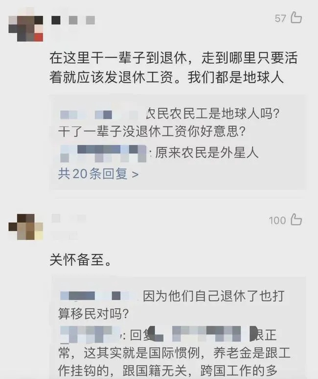 也有人表示:“ 养老金是当时交的养老保险钱,是自己的钱。在这里干一辈子到退休,走到哪里只要活着就应该发退休工资。”