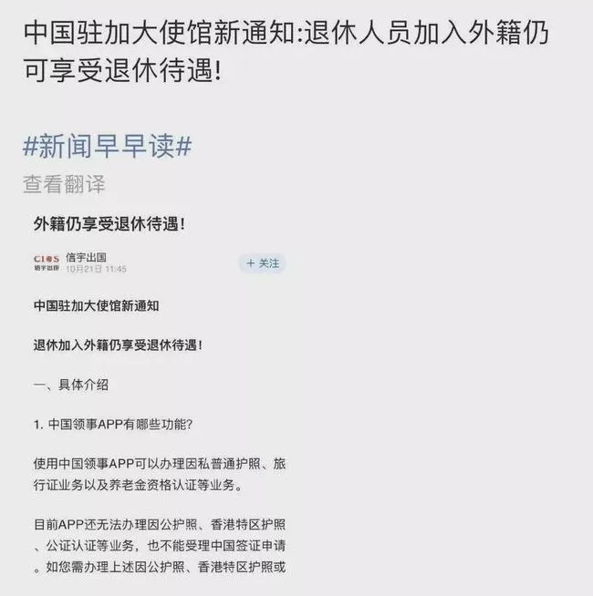 当时,有网友在微博发帖称,“中国驻加拿大大使馆新通知:退休人员加入外籍仍可享受退休待遇。”