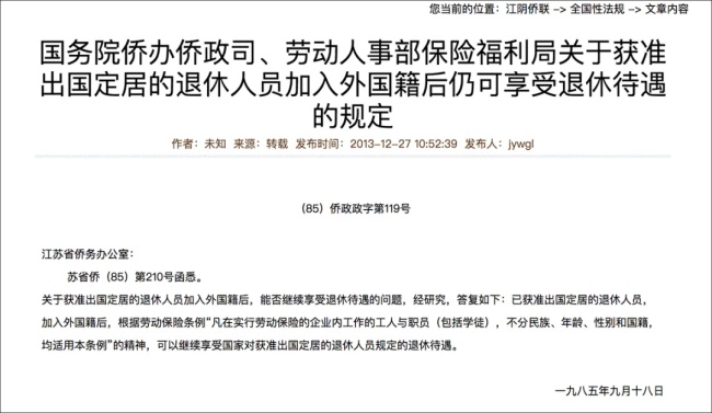 事实上,退休人士加入外籍后领取养老金是个老政策,早在1985年中国就有此规定。